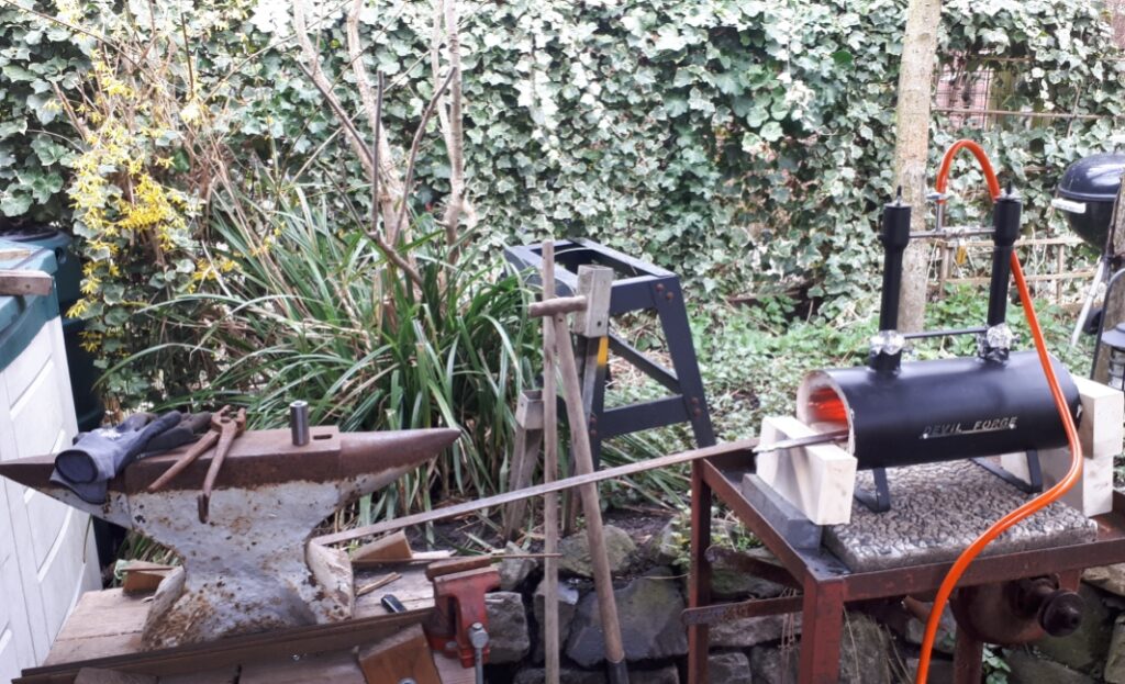 De smederij is eindelijk operationeel. Lekker in de buitenlucht. Met mijn gasoventje, aambeeld en veel fantasie kan ik nu diverse smeed klussen doen. Dus verwacht binnenkort meer ijzer en smeedwerk van mij.