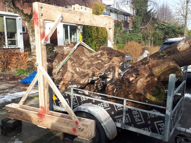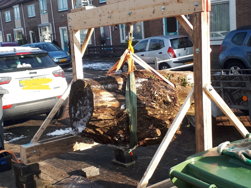 Een modulaire en mobiele takel-bok die met gemak deze enorme stronken hout kan tillen.