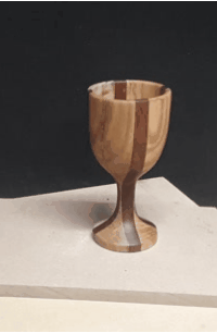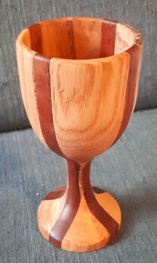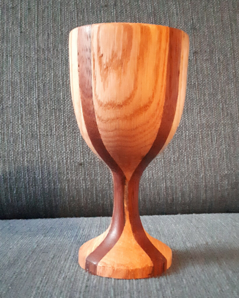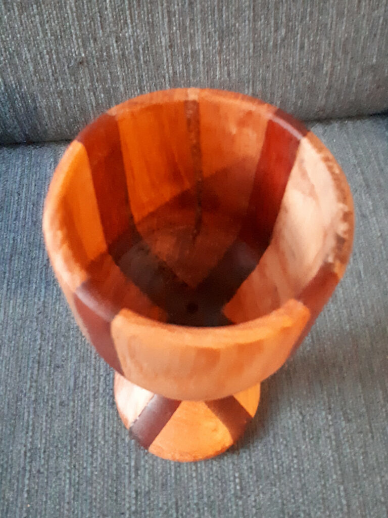 Mooie kelk, 20 cm hoog, 10 cm doorsnede. stukken eiken, beuk en azobe. Bewerkt met deense olie.