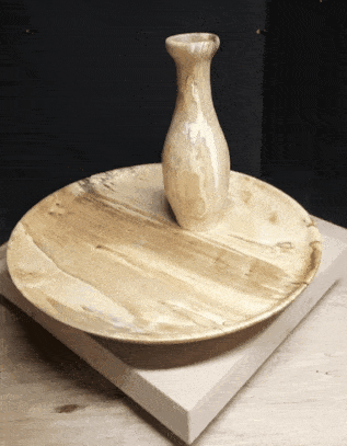 Set van een bord en vaasje van esdoorn gemaakt in opdracht. Schaal is 42 cm en vaasje 25 cm. Behandeld met druivenpit olie en was.VERKOCHT.Klik op de afbeelding voor een vergroting.