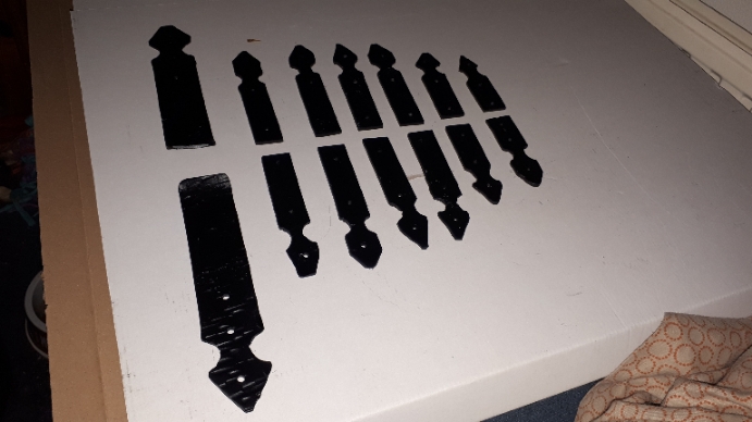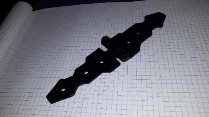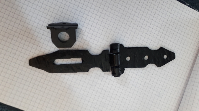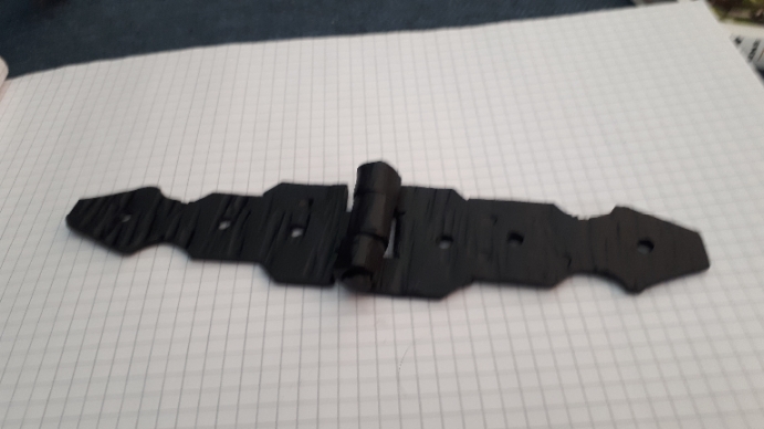 Scharnieren, slot overslag en sierstrips gesmeed in opdracht als beslag voor op een houten product.