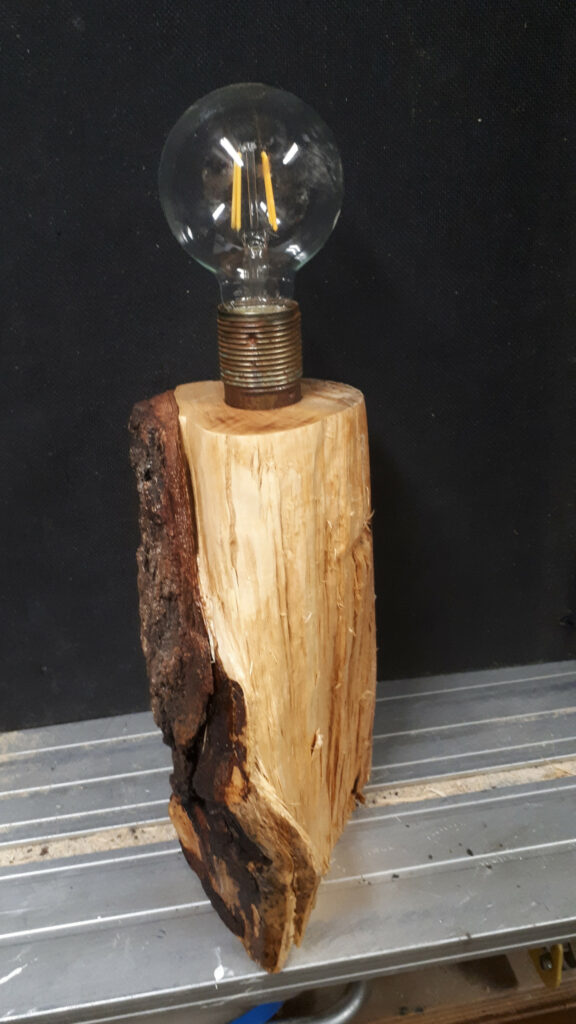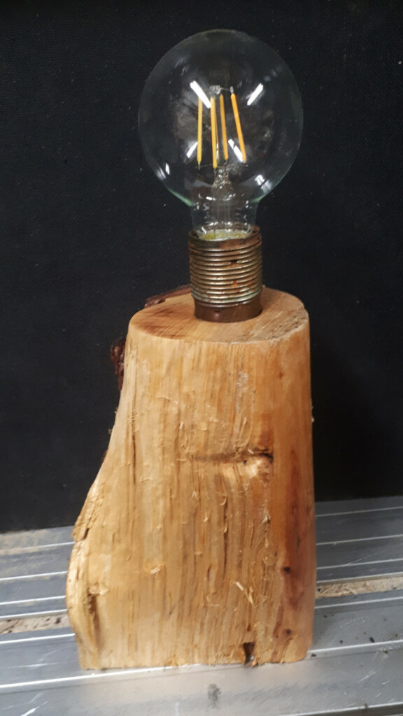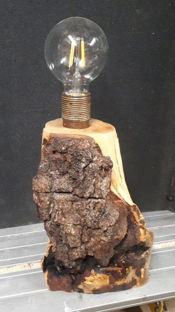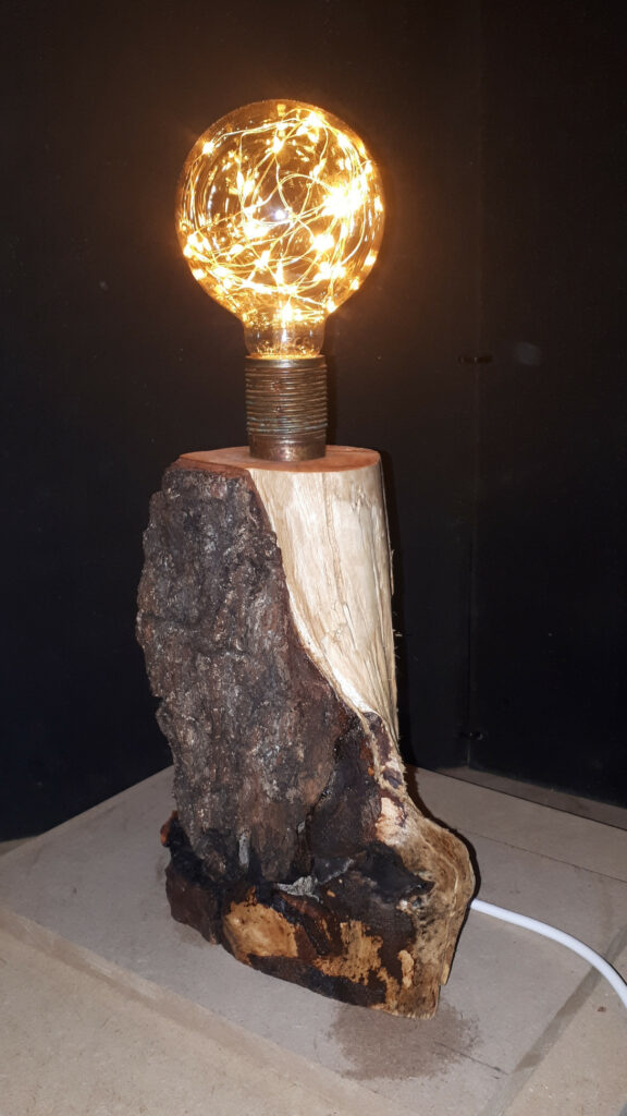 Sprookjesachtige staande stam lamp van ruw stuk beuken. 30 cm hoog. Inclusief LED filament lamp.Prijs: e 34.50