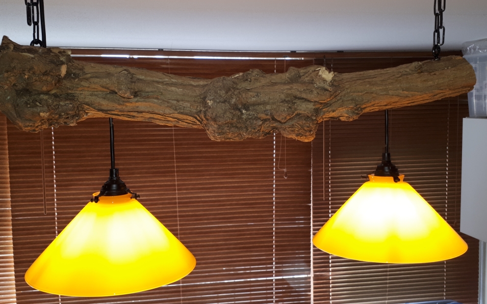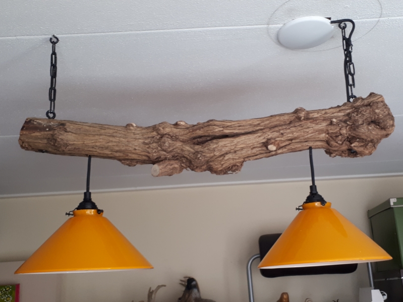 Sprookjesachtige vintage boomstamlamp. Combinatie van 70’er jaren lampen en moderne LEDs, hangend aan een robuuste stam van een vlinderstruik. ongeveer 70 cm lang. Gemaakt in opdracht.