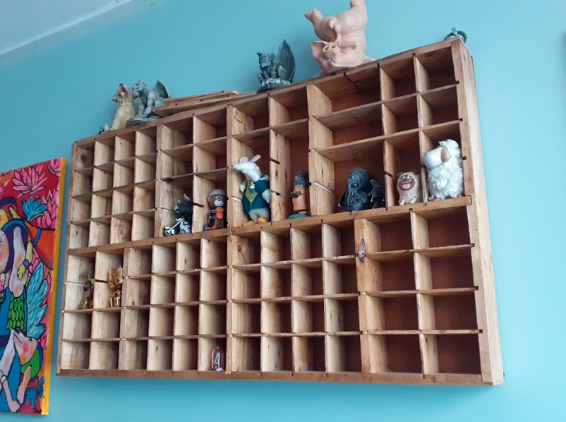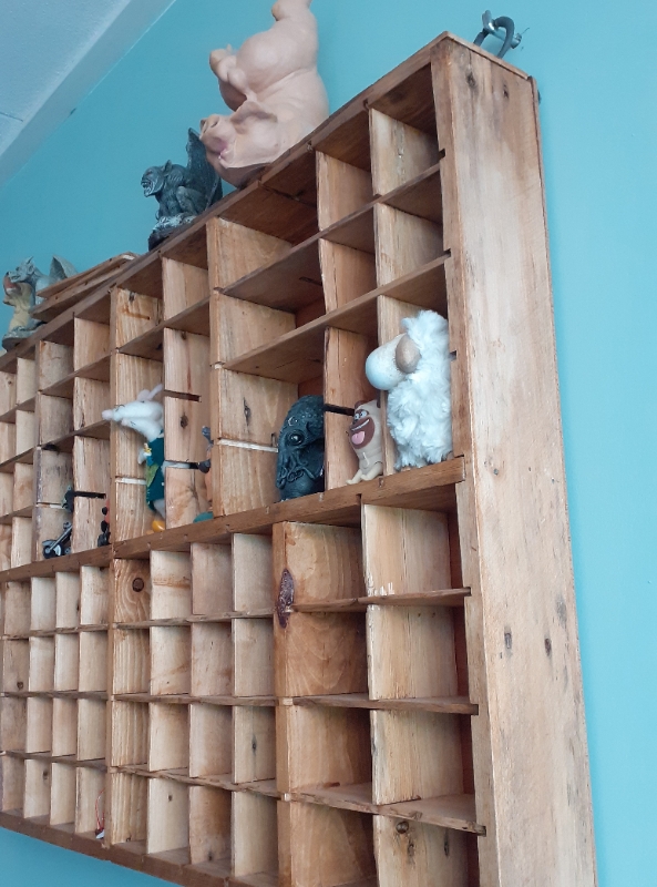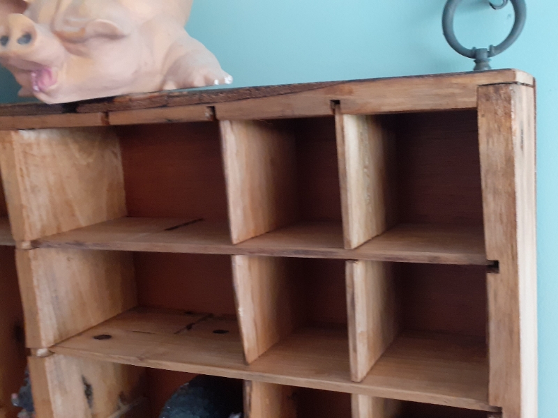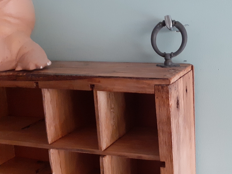 Decoratieve Letterbak waar je mooi al je kleine souveniers, herinneringen of beeldjes in op kunt stellen. Gemaakt van hergebruikt pallethout voor een vintage/gebruikte look. Voorzien van ophang ogen. 100 c breed en 60 cm hoog.