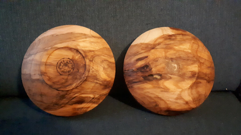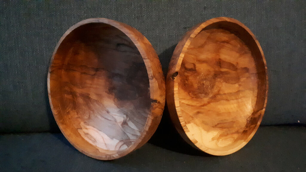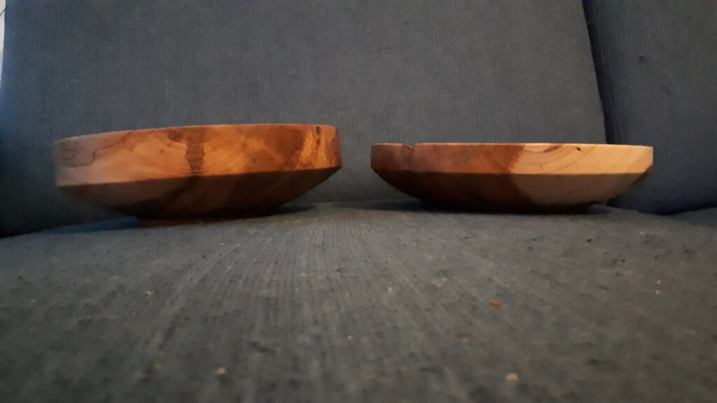 Twee schalen in spiegelbeeld (open boek) uit 1 stuk Essenhout gemaakt. 20 cm doorsnede en 8 en 5 cm hoog. Afgewerkt met deense olie.