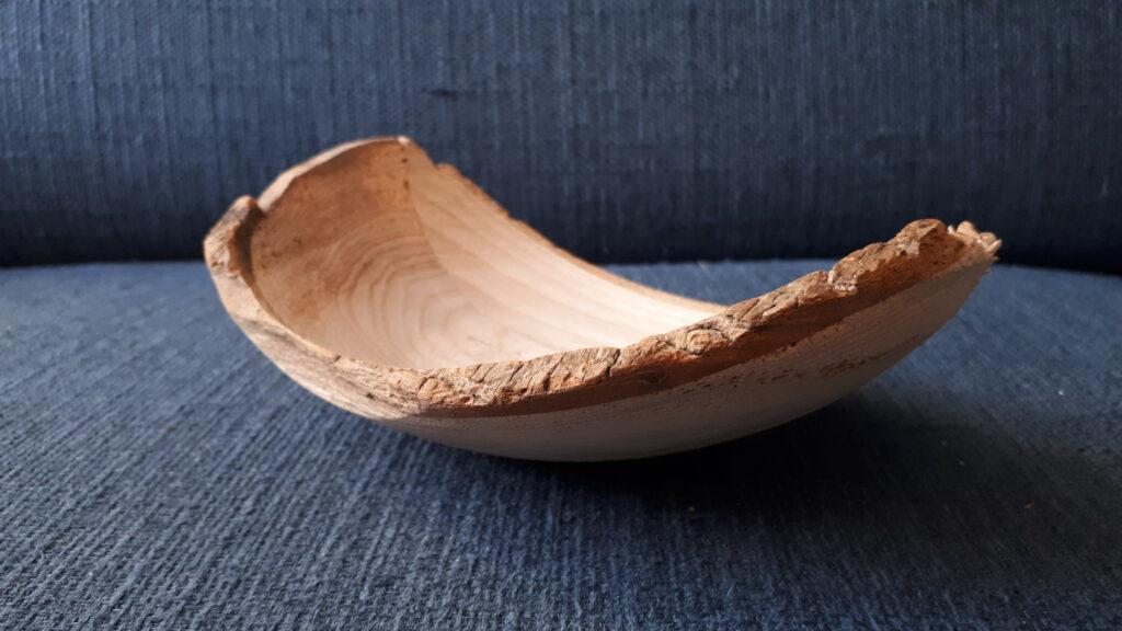Kop en “live edge” schotel, kop 10cm, schaaltje 20 cm. samengevoegde reststukken hout.